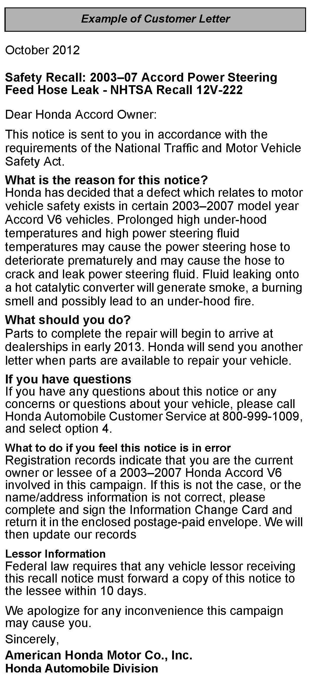 Safety Recall: 2003-07 Accord Power Steering Feed Hose Leak (Supersedes 12-066, dated September 27, 2012; see REVISION SUMMARY)