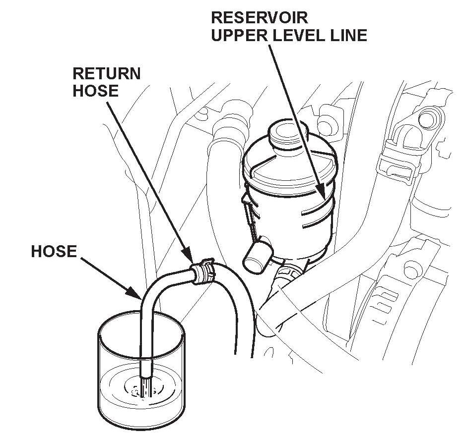 ^ Connect a properly sized hose to the disconnected return hose, and put the hose in a container large enough to hold the fluid.
