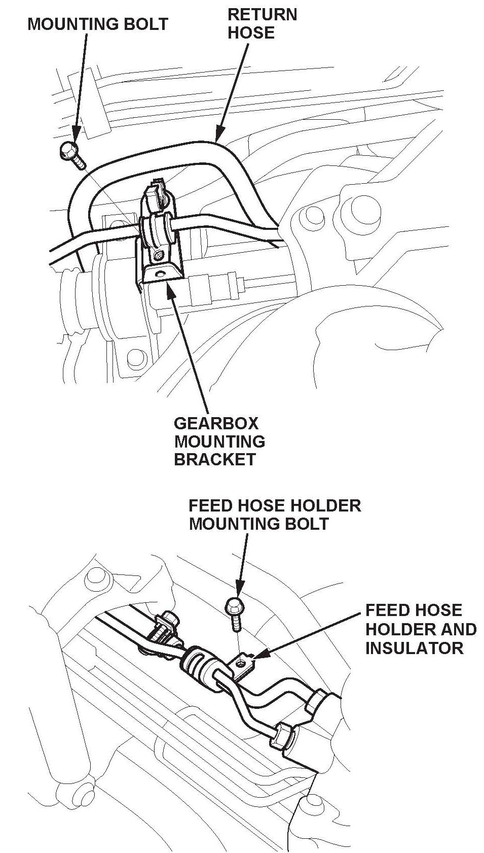 12. Push up on the rear engine mount bracket and remove the P/S feed hose. Wipe up any P/S fluid that may have spilled.