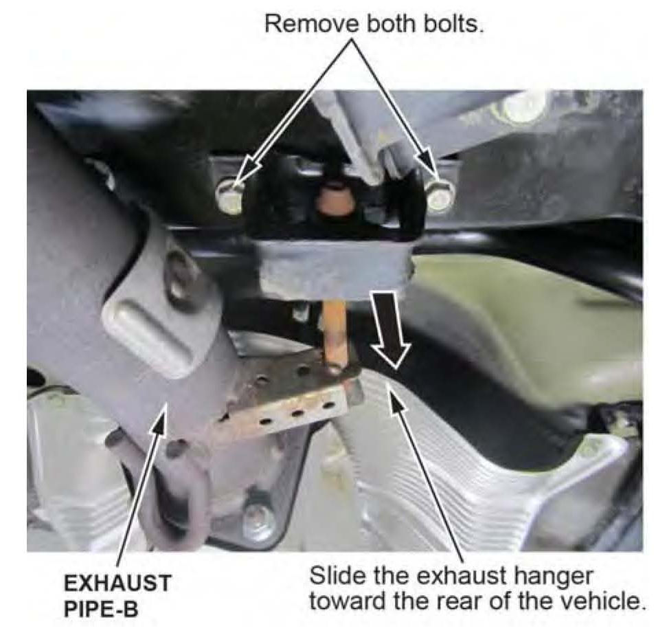 9. Raise the vehicle, and remove the exhaust hanger bracket bolts, and slide the exhaust hanger to the rear of the vehicle.