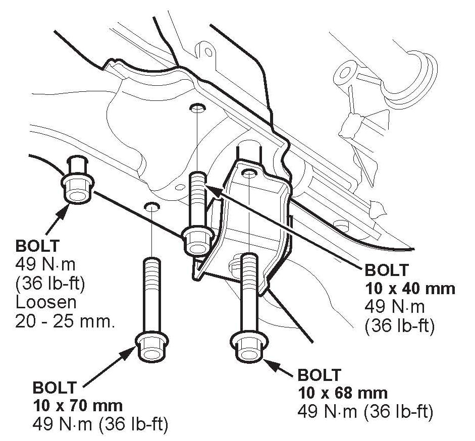 19. Reinstall, and torque the rear engine mount bracket bolts to 49 N.m (36 lb-ft).