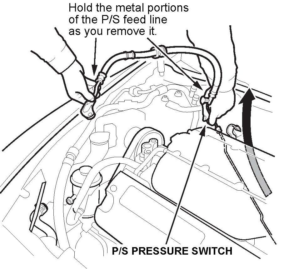 14. Remove the P/S feed hose from the top of the engine. Make sure you don't damage the high pressure switch because it will be reused.