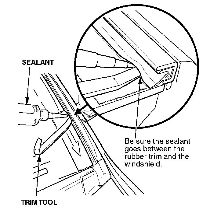 Make sure the roof molding clips at the lower corner of the windshield are engaged, and seal the lower part of the roof molding rubber trim to the windshield.