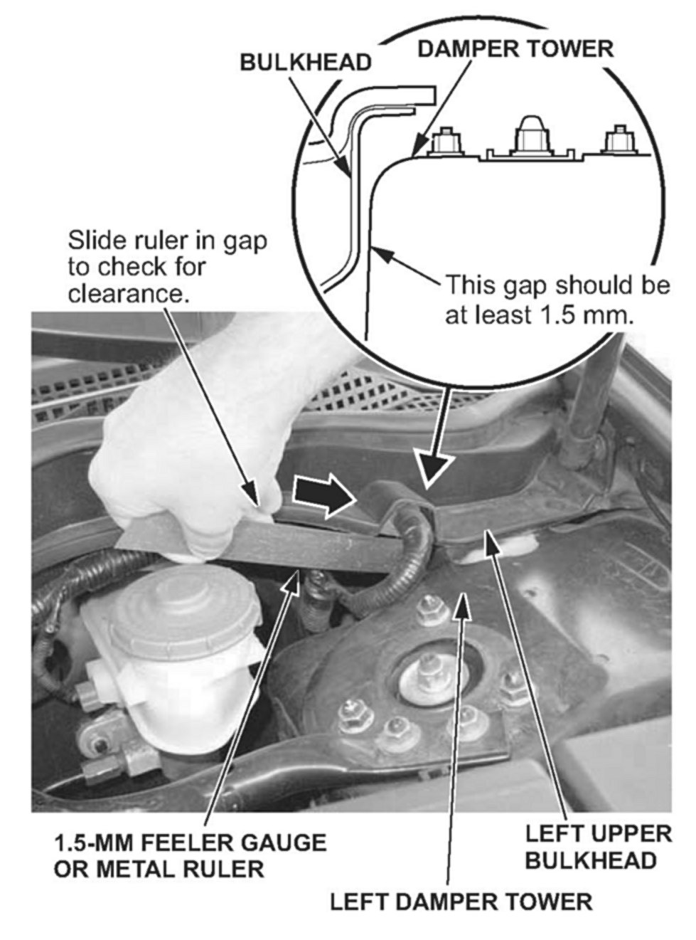2. Open the hood, and slide a long 1.5-mm feeler gauge or a similar thickness metal ruler between the left upper bulkhead and the left damper tower.