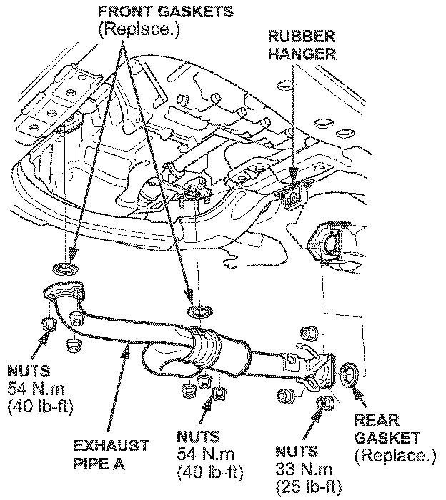 9. Reattach exhaust pipe A to the warm-up catalytic converters with two new front gaskets and six new nuts. Torque the nuts to 54 Nm (40 lb-ft).