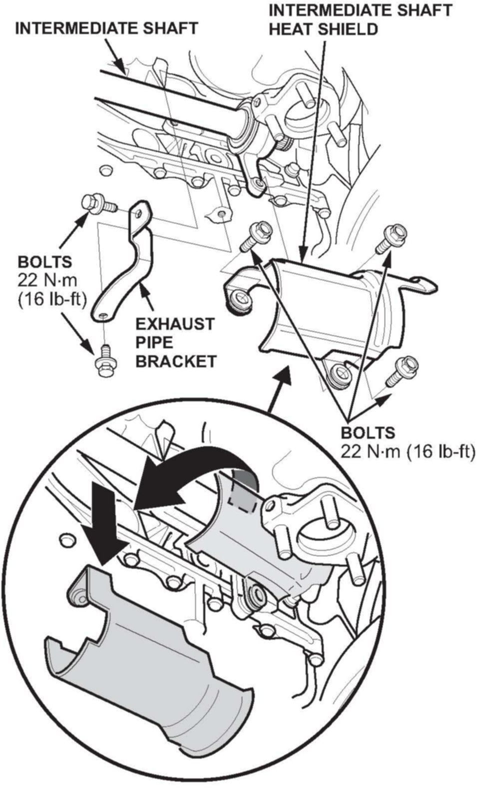 6. Install a new intermediate shaft heat shield with the original bolts. Torque the bolts to 22 Nm (16 lb-ft).