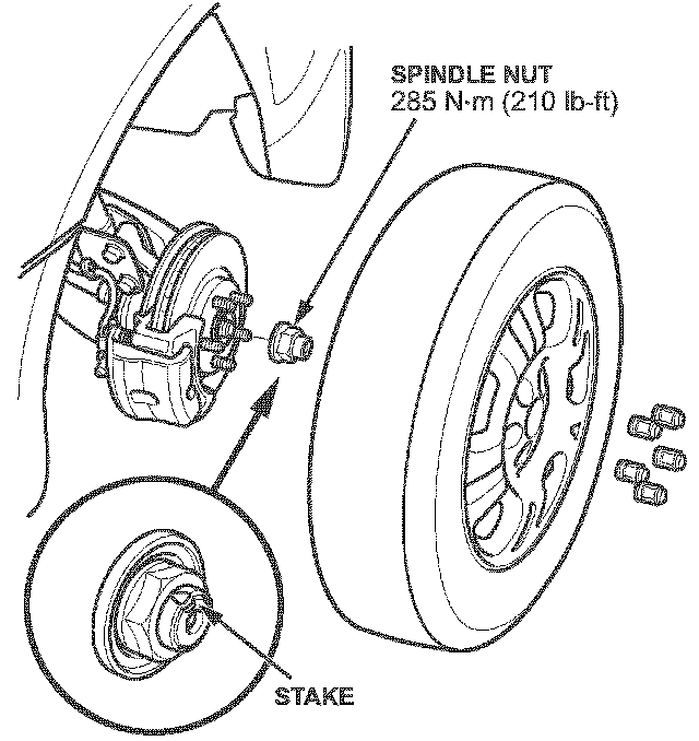 24. Install the new spindle nut, and torque it to 285 Nm (210 lb-ft). After torquing the nut, stake its shoulder to the end of the driveshaft with a drift.