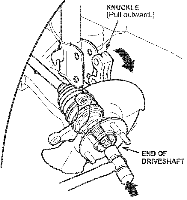 6. Pull the knuckle outward, separating it from the damper assembly, then release the right driveshaft from the wheel hub by tapping the end of the driveshaft with a plastic hammer.