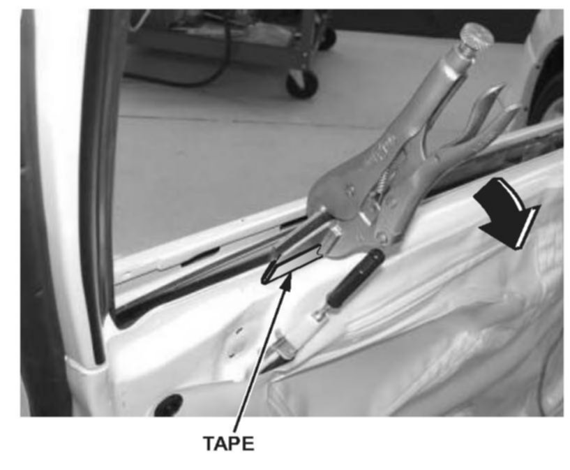 4. Using wide mouth locking pliers with protective tape on the jaws, bend the inner door skin toward the middle of the car until the 30.5 mm gap is achieved.