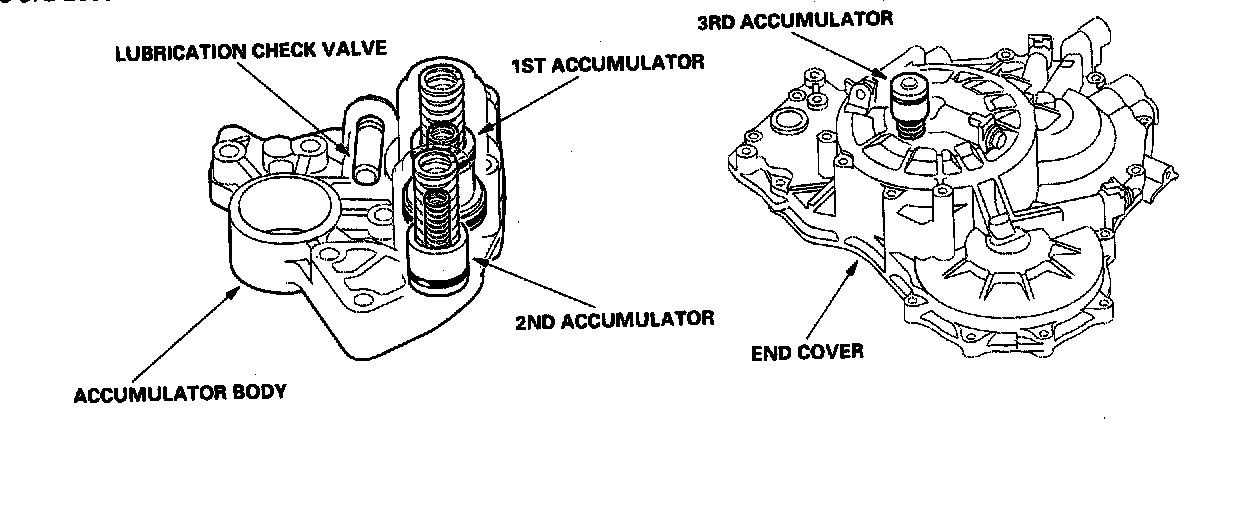 The accumulator body is on the torque converter housing, next to the main valve body. It contains the 1st and 2nd accumulators and the lubrication check valve.