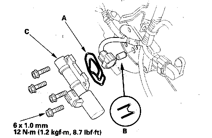 11. Install the new gasket in the mounting groove of the A/T clutch pressure control solenoid valve C body properly, then install A/T clutch pressure control solenoid valve C on the transmission housing. Do not pinch the gasket.