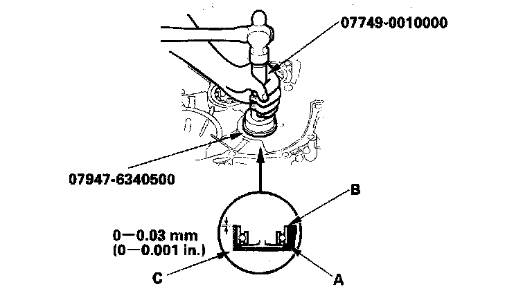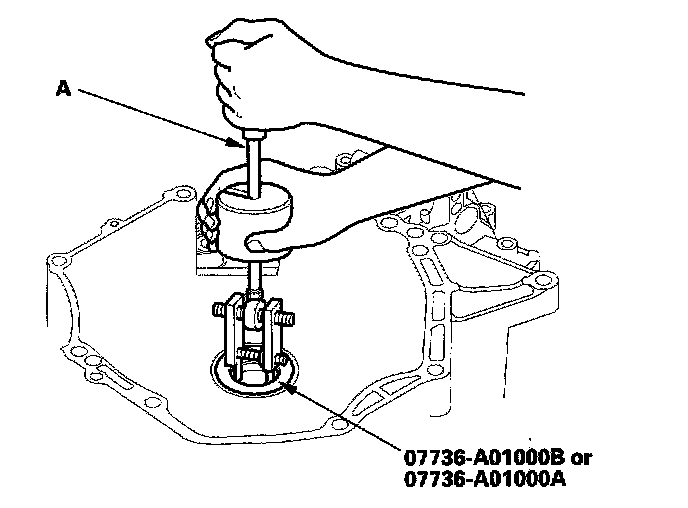 1. Remove the mainshaft bearing and oil seal with the special tool and a commercially available 3/8"-16 slide hammer (A).