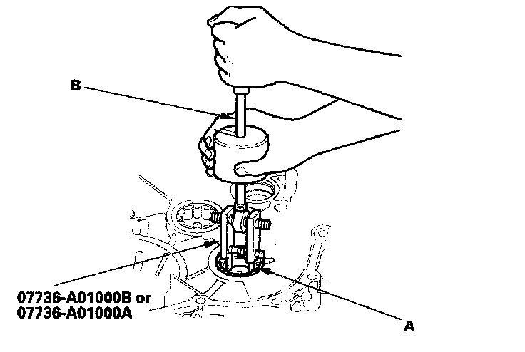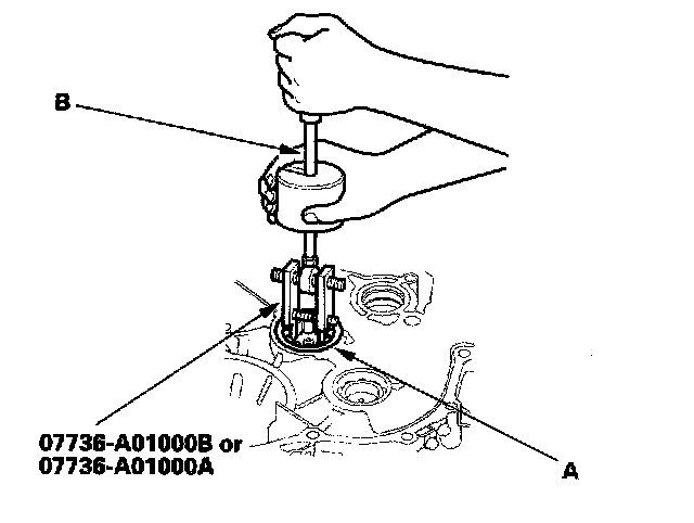 1. Remove the secondary shaft bearing (A) with the special tool and a commercially available 3/8"-16 slide hammer (B).