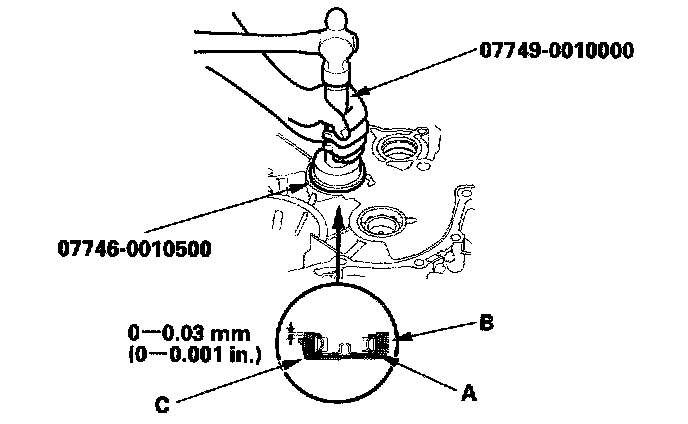 3. Install the new bearing (B) into the housing (C) with the special tools.