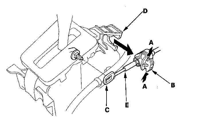 4. Press the holder lock release (A), and pull out the socket holder (B) on the shift cable (C) of the shift lever bracket base (D). Do not remove the shift cable by pulling the shift cable guide (E).