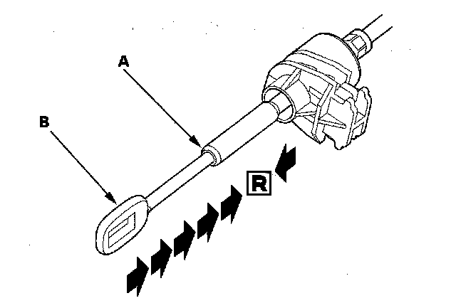 5. Push the shift cable until it stops, then release it. Pull the shift cable back one step so that the shift position is in R. Do not hold the shift cable guide (A) to adjust the shift cable (B).