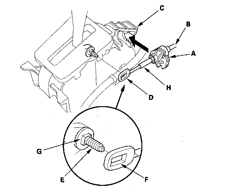 9. Align the socket holder (A) on the shift cable (B) with the slot in the bracket base (C), then slide the holder into base. Install the shift cable end (D) over the mounting stud (E) by aligning its square hole (F) with the square fitting (G) at the bottom of the stud. Push the holder until it snaps securely in place. Do not install the shift cable by holding the shift cable guide (H).