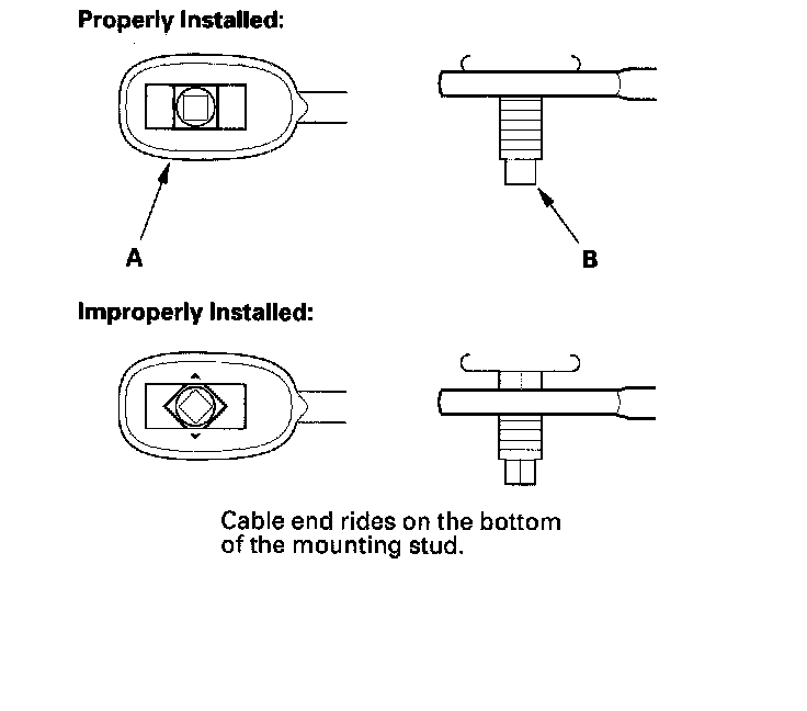 10. Verify that the shift cable end (A) is properly installed on the mounting stud (B).