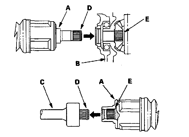 3. Clean the areas where the driveshaft contacts the differential thoroughly with solvent or brake cleaner, and dry with compressed air. Insert the inboard end (A) of the driveshaft into the differential (B) or intermediate shaft (C) until the new set ring (D) locks in the groove (E).