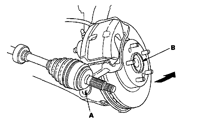 9. Install a new spindle nut (A), then tighten the nut. After tightening, use a drift to stake the spindle nut shoulder (B) against the driveshaft.