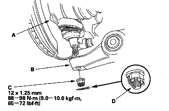 5. Install the knuckle (A) onto the lower arm (B). Wipe off the grease before tightening the nut at the ball joint. Torque the new castle nut (C) to the lower torque specification, then tighten it only far enough to align the slot with the pin hole. Do not align the nut by loosening it.