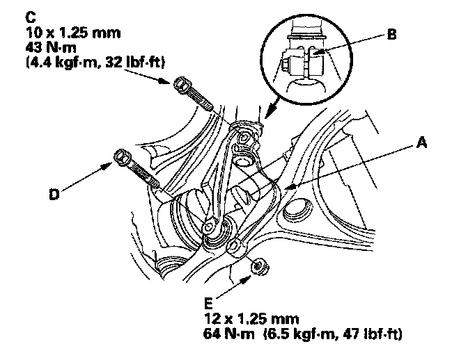 8. Loosely install the flange bolt (D) and a new self-locking nut (E).