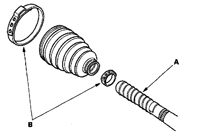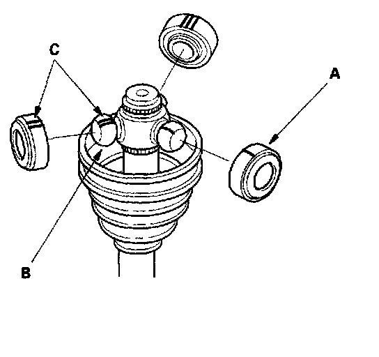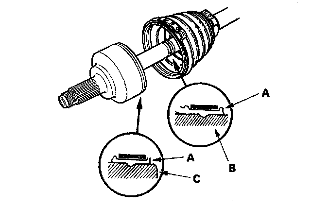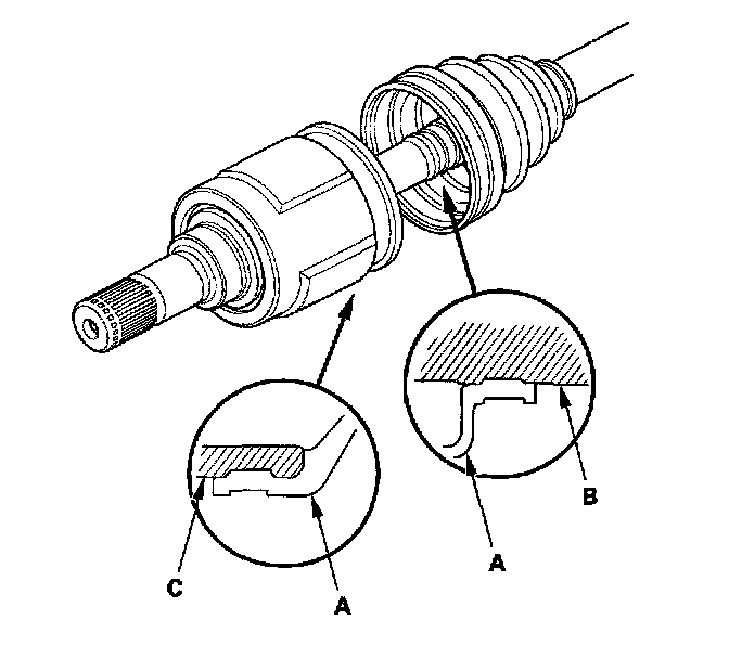 9. Fit the boot (A) ends onto the driveshaft (B) and outboard joint (C).