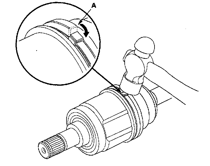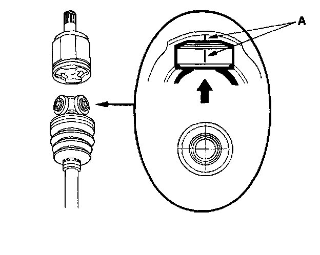 ^ Reinstall the inboard joint onto the driveshaft by aligning the marks (A) on the inboard joint and the rollers.