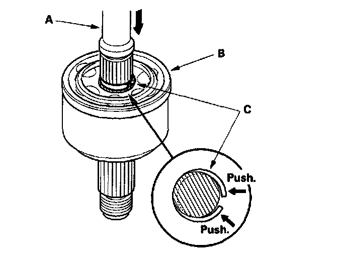 4. Insert the driveshaft (A) into the outboard joint (B) until the stop ring (C) is close to the joint.