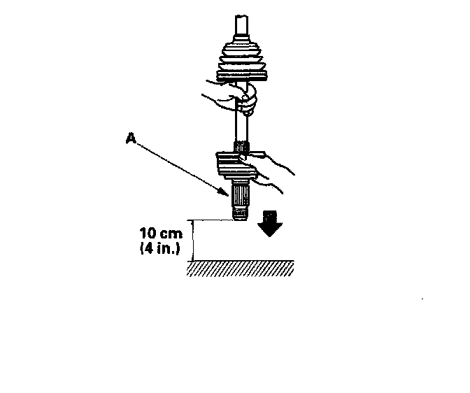 5. To completely seat the outboard joint, pick up the driveshaft and joint, and drop them from about 10 cm (4 inch) onto a hard surface. Do not use a hammer as excessive force may damage the driveshaft. Be careful not to damage the threaded section (A) of the outboard joint.