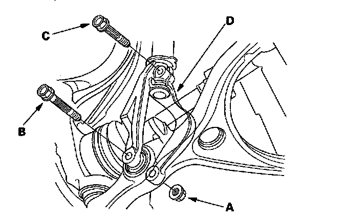 6. Remove the self-locking nut (A), 12 mm flange bolt (B), and 10 mm flange bolt (C), then remove the damper fork (D).