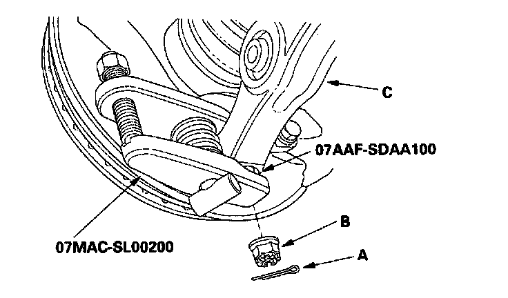 8. Separate the ball joint from the lower arm (C) with the special tool.