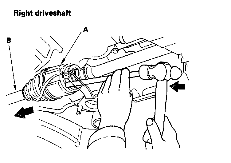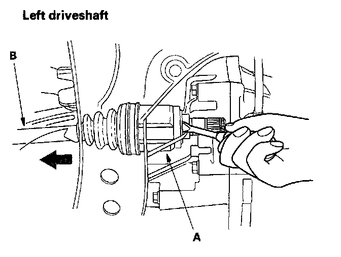 10. Left driveshaft: Pry the inboard joint (A) from the differential case with a prybar. Right driveshaft: Drive the inboard joint (A) off of the intermediate shaft with a drift and hammer. Remove the driveshaft as an assembly. Do not pull on the driveshaft (B), because the inboard joint may come apart. Pull the driveshaft straight out to avoid damaging the oil seal.