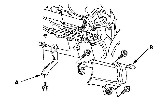 4. Remove the exhaust pipe bracket (A) and heat shield (B).