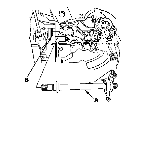 6. Remove the intermediate shaft (A) from the differential. Hold the intermediate shaft horizontally until it is clear of the differential to prevent damage to the differential oil seal (B).