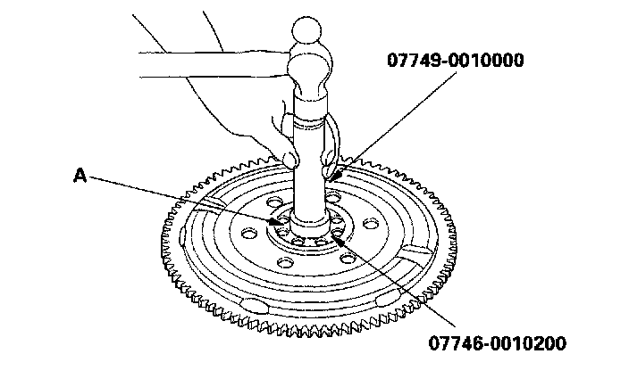 4. Install the new pilot bearing (A) into the flywheel using the special tools. Apply a light coat of oil to the bearing surface.