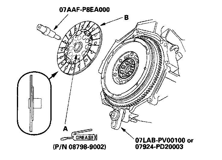 3. Apply super high temp urea grease (P/N 08798-9002) to the splines (A) of the clutch disc (B), then install the clutch disc using the special tools.