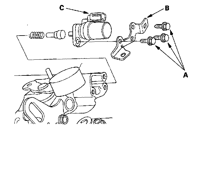 7. Remove the bolts (A), transmission harness stay (B), and reverse lockout solenoid assembly (C).