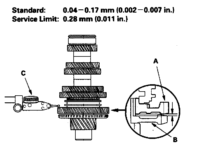 1. Measure the clearance between the 1st gear (A) and the countershaft reverse gear (B) with a dial indicator (C). If the clearance is more than the service limit, go to step 2.