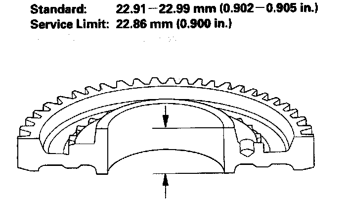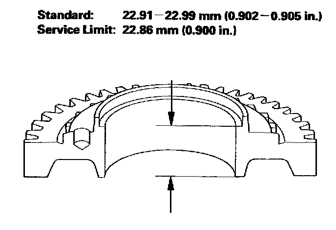 ^ If the thickness is less than the service limit, replace 2nd gear. If the thickness is within the service limit, replace the 1st/2nd synchro hub.