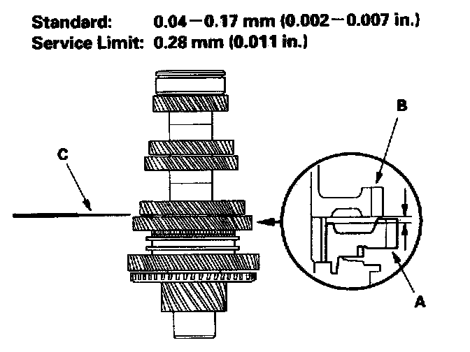 4. Measure the clearance between the 2nd gear (A) and 3rd gear (B) with a feeler gauge (C). If the clearance is more than the service limit, go to step 5.