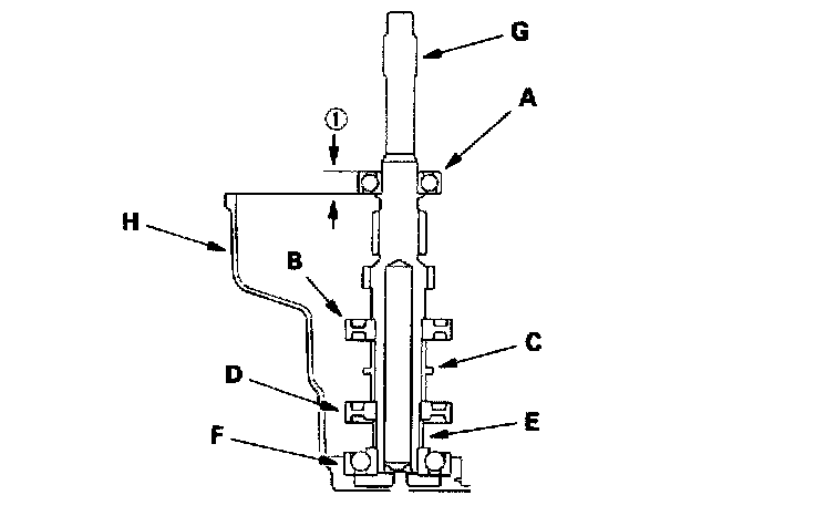 2. Install the ball bearing (A), 3rd/4th synchro hub (B), distance collar (C), 5th/6th synchro hub (D), distance collar (E), and ball bearing (F) on the mainshaft (G), then install the assembled mainshaft in the transmission housing (H).