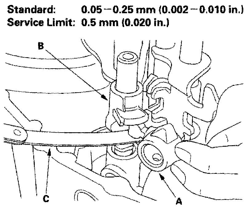 Shift Arm Clearance Inspection1. Measure the clearance between the shift arm (A) and shift piece (B) with a feeler gauge (C). If the clearance is more than the service limit, go to step 2.