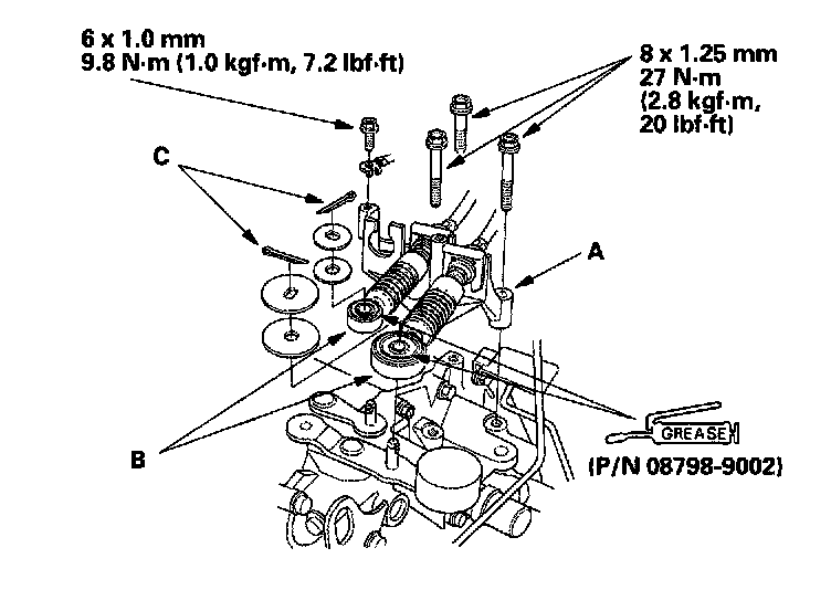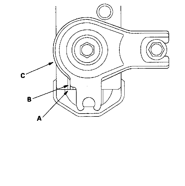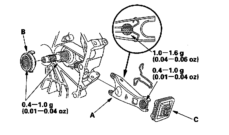 2. Apply super high temp urea grease (P/N 08798-9002) to the release fork (A) and the release bearing (B). Install the release fork, the release bearing, and the boot (C).