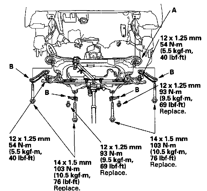 9. Install the front suspension subframe (A) and front suspension subframe stays (B).