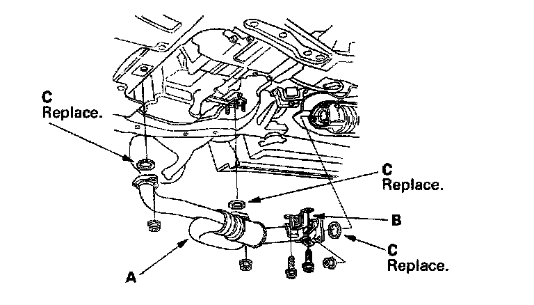 18. Install the exhaust pipe A, mount (B) and new gasket (C).