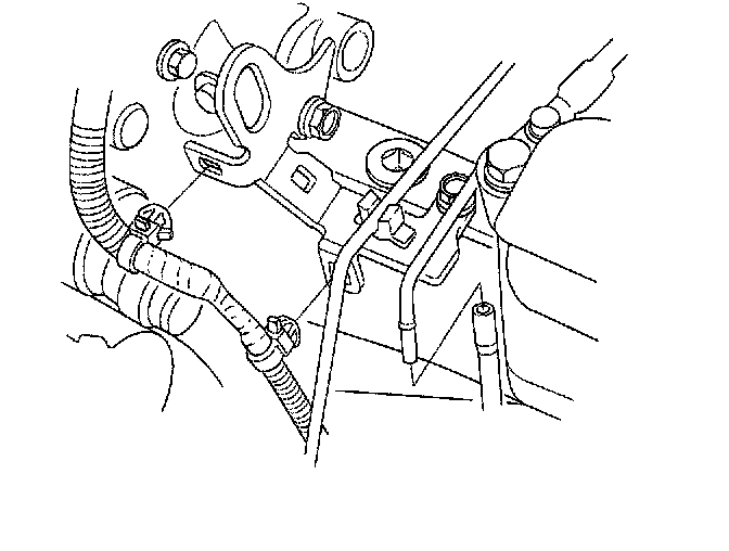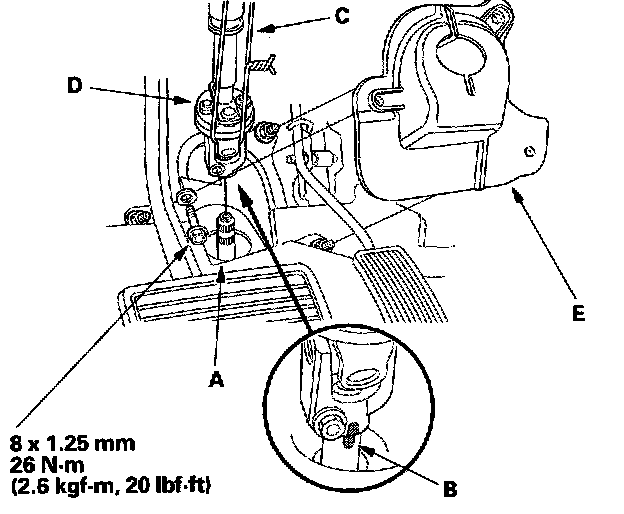 31. Install the power steering pump outlet line (A) with a new O-ring (B) to the pump (C), and install the hose (D) in its clamp (E).