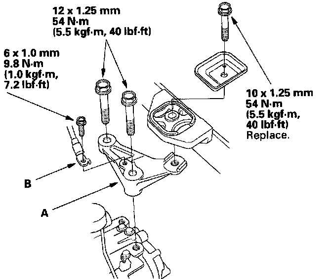 3. Install the transmission front lower mount (A) and the transmission rear lower mount (B).