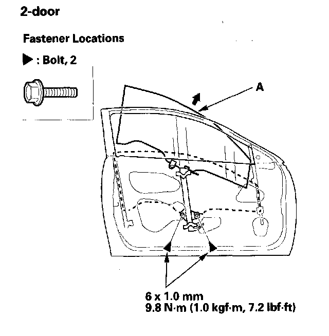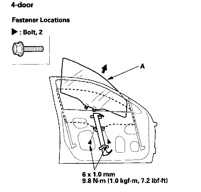 4. Carefully raise the glass (A) until you can see the bolts, then remove them. Carefully pull the glass out through the window slot. Take care not to drop the glass inside the door.