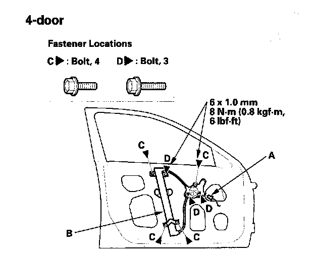 6. Remove the bolts (C), and loosen the bolts (D), then remove the regulator through the hole in the door.